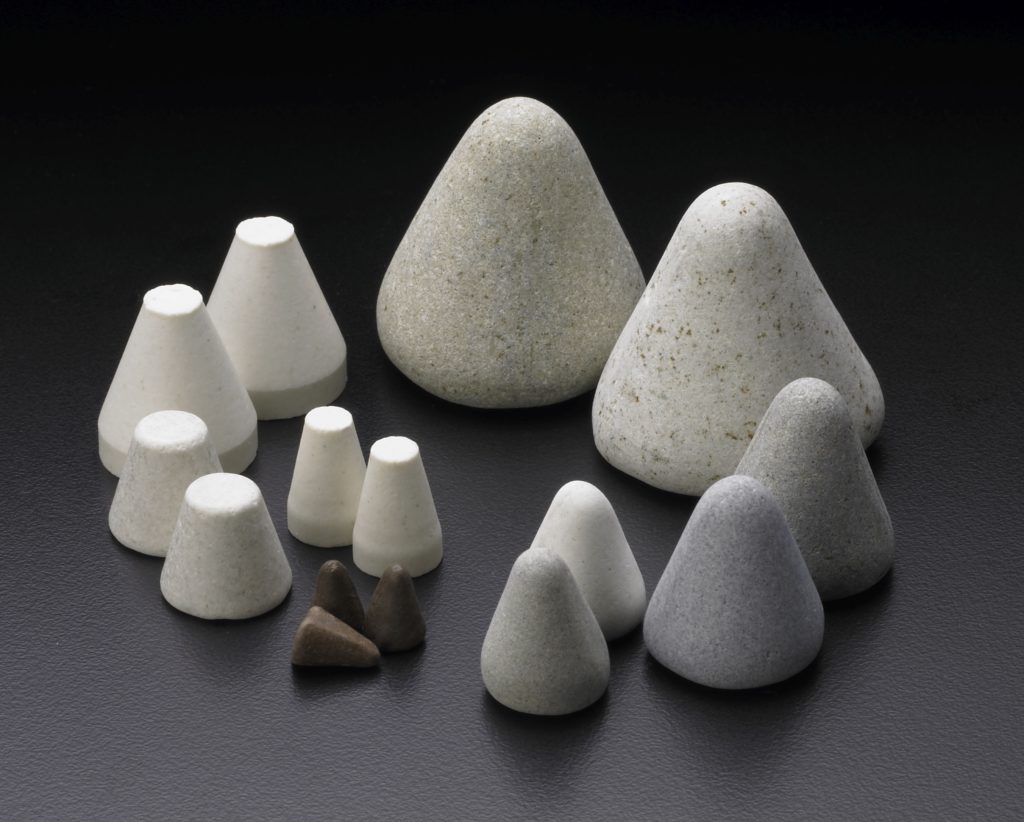 ![]() | Cones | 3/8″ x 1/2″ 1/2″ x 5/8″ 9/16″ x 5/8″ 11/16″ x 3/4″ 3/4″ x 7/8″ 1 1/4″ x 1 1/4″ | Due to its tapered shape, cone media extends media life and has anti-wedging characteristics that reduce or eliminate lodging. Good media for parts with holes. |